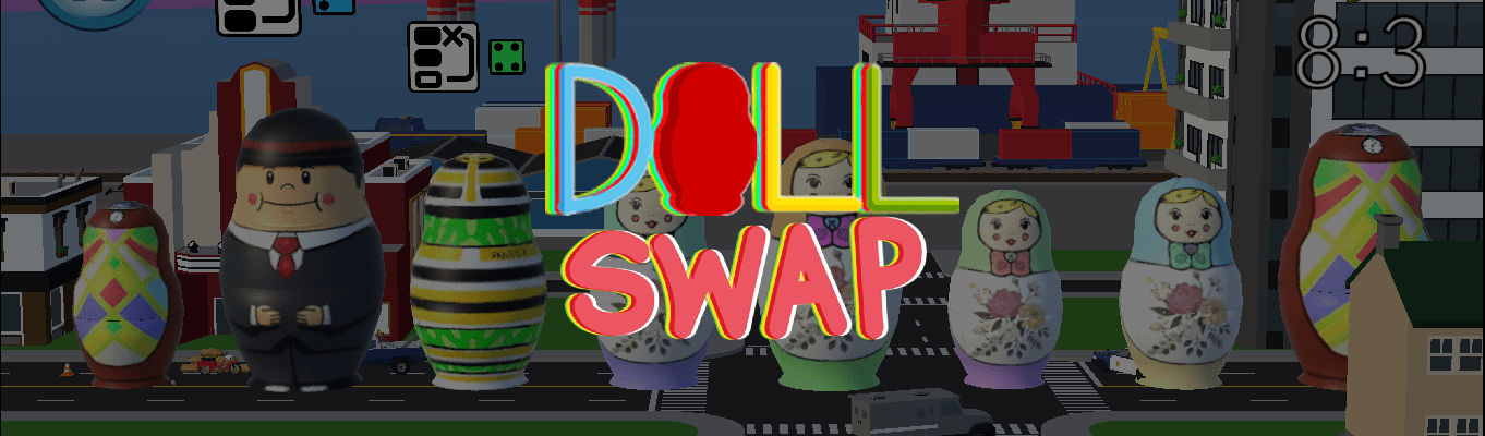 Doll Swap is a hyper casual mobile game where the player is tasked to sort Russian dolls from small to large, upon sorting all the dolls on screen they stack up and a set of larger dolls is revealed. This gives the player a sense of exploration as the dolls grow from ant-sized at the start of the game to taking up most of the planet later on. Once the player is comfortable with this concept they can use their in game currency to purchase additional challenge dolls that will appear in the game. These challenge dolls provide a variation to the sorting puzzles, such as locking dolls in place or giving extra points if they’re swapped in the last turn.